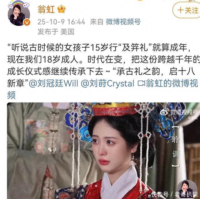 10月9日下午,演员翁虹在个人社交平台发布了一组剪辑视频,视频内容是她与丈夫为女儿小水晶(大名刘莳)举办18岁及笄礼的仪式剪辑。 翁虹说,古代15岁女孩进行“及笄礼”就算成年,现在我们是18岁算成年,时代在变,把这份跨越千年的成长仪式感继续传承下去~“乘古礼之韵,启十八新章。”